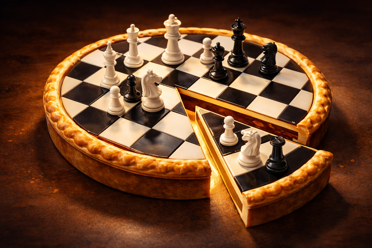 The name "Pie Chess" is an allusion to the pie rule, where someone cuts a pie into two slices and lets the other person choose which slice they want, incentivizing cutting it fairly. This rule is used in other games such as Hex to make the first move more fair. Similarly, in Pie Chess, the player who sets up the position must create a balanced position, knowing that their opponent will get to choose the more advantageous side.
